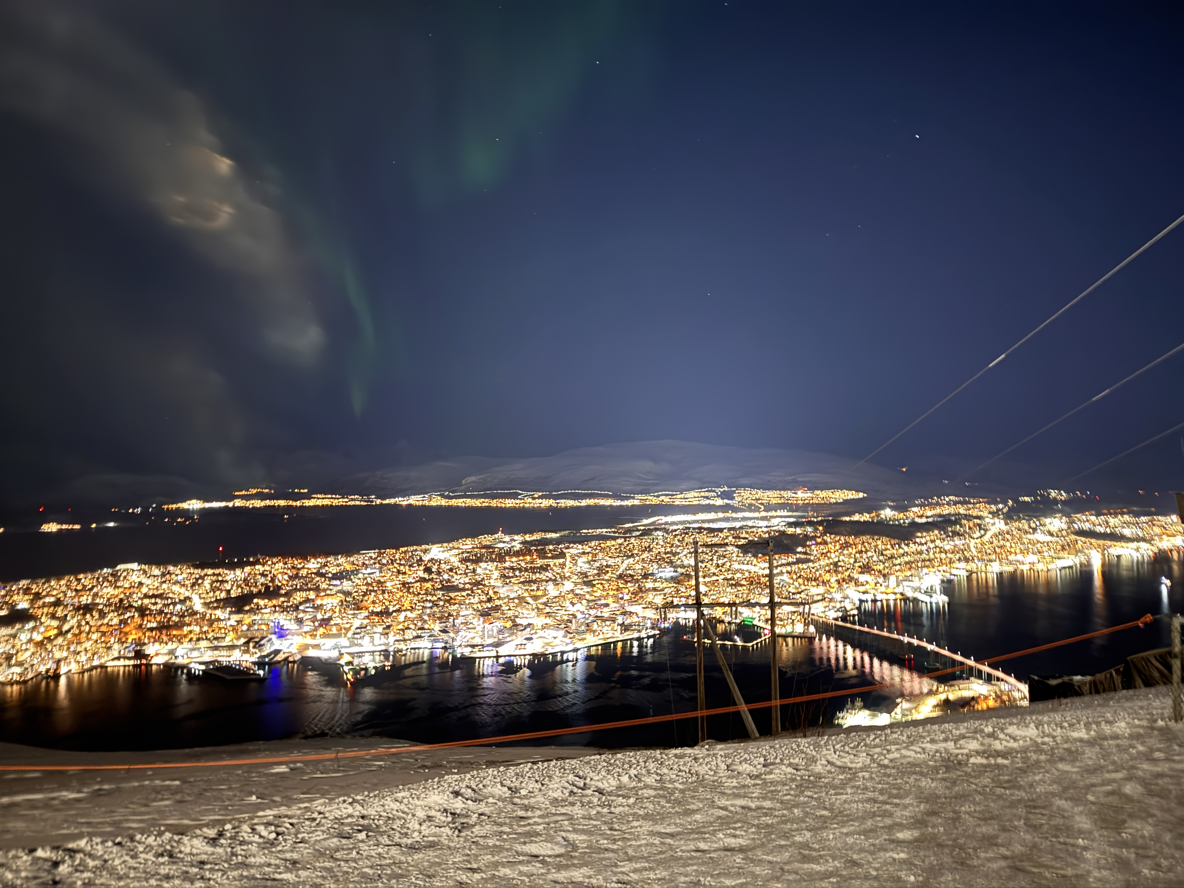 Von Frankfurt ging es per Direktflug mit der Lufthansa in rund 3,5 Stunden nach Tromsø. Nach dem Check-In im modernen Hotel The Dock blieb bis zum gemeinsamen Abendessen noch etwas Freizeit für einen kurzen Bummel durch die zauberhafte Hauptstadt Nord-Norwegens - mit ca. 70.000 Einwohnern gleichzeitig die größte Stadt nördlich des Polarkreises. Nach dem Abendessen unternahmen wir dann noch einen kurzen Ausflug mit der Fjellheisen-Luftseilbahn auf den Hausberg Storsteinen. Von hier aus hatten wir einen wunderschönen Ausblick auf das beleuchtete Tromsø und kamen das erste Mal in den Genuss die magischen Polarllichter zu sehen.