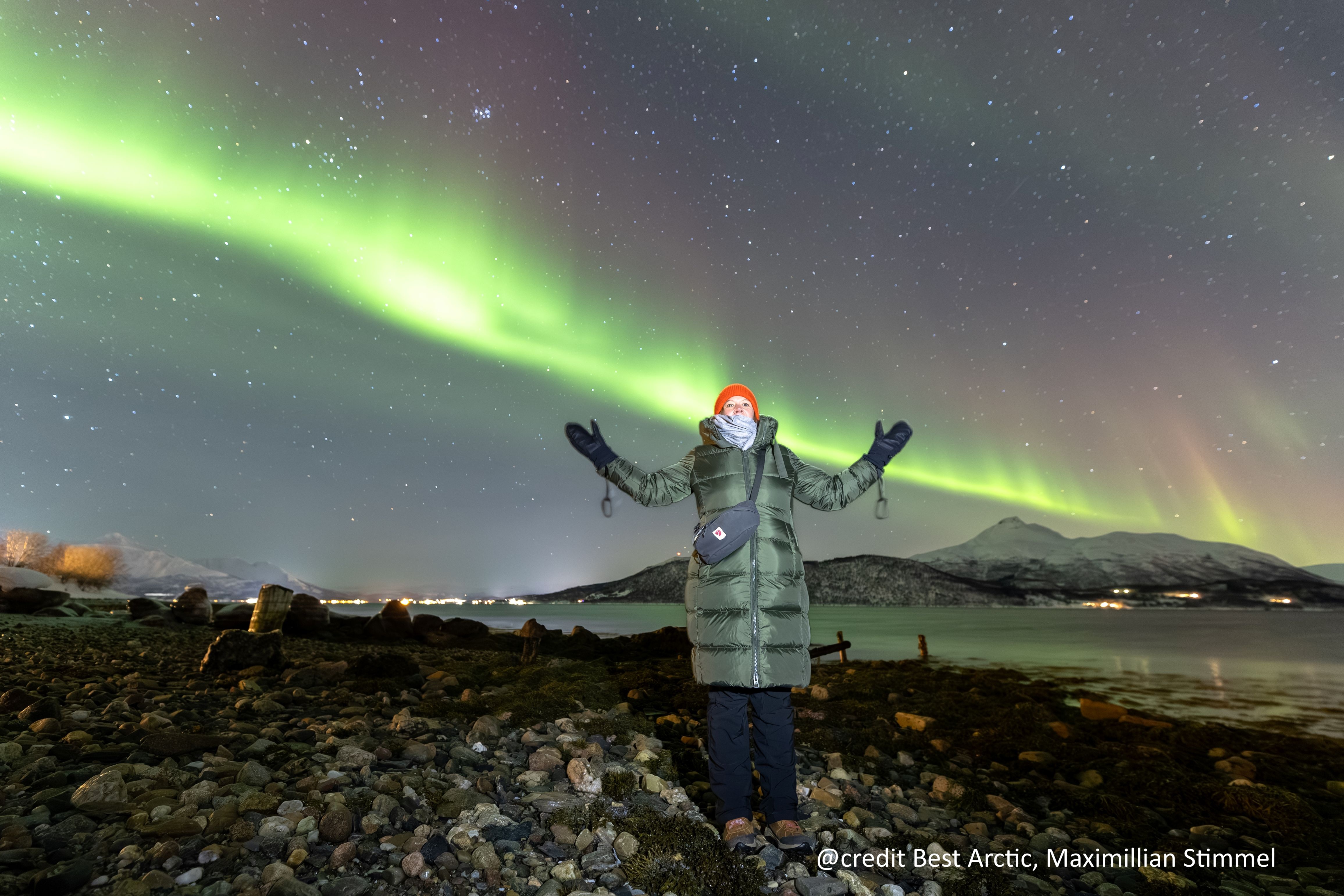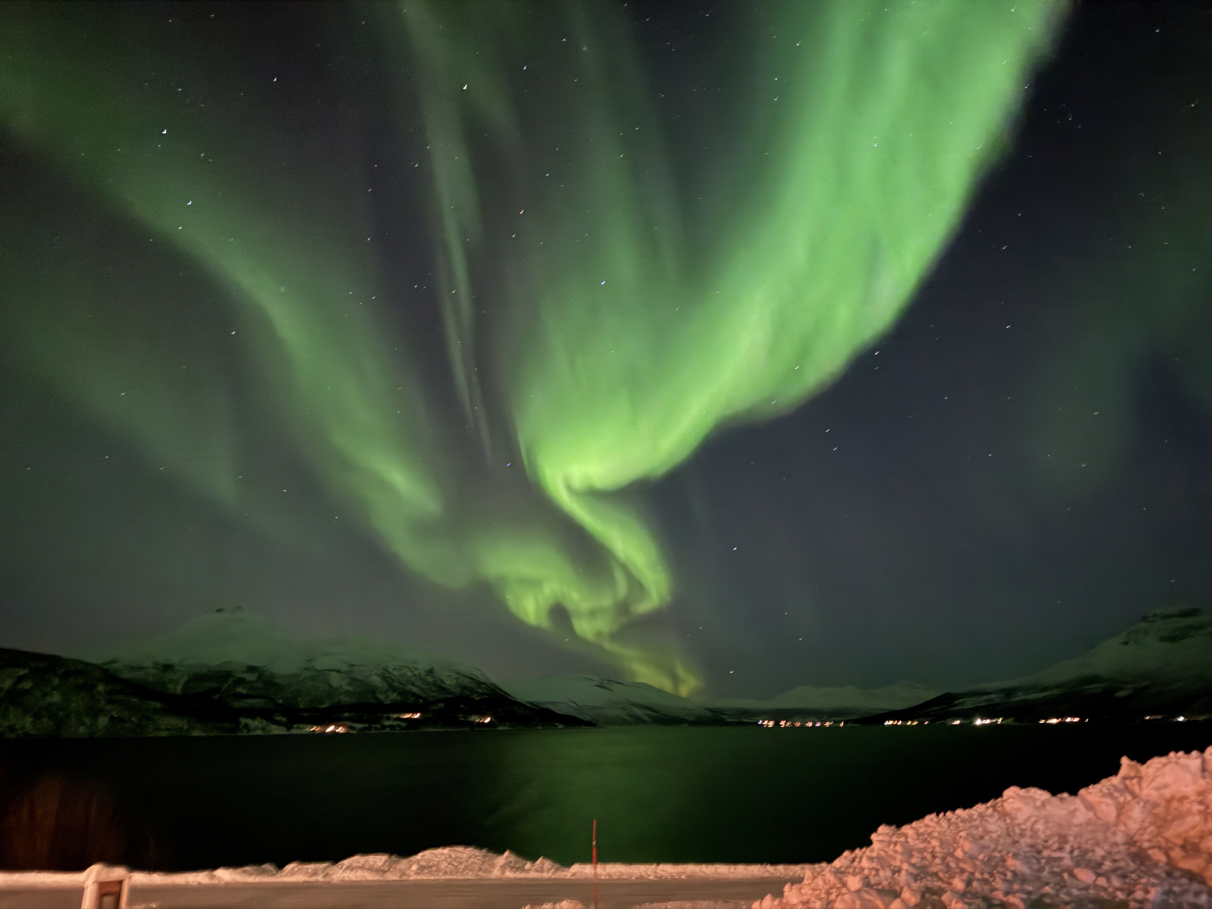 Auf dem Rückweg in Richtung Tromsø kehrten wir für ein gemütliches Abendessen in einem typischen Restaurant ein, bevor das letzte Highlight des Tages auf uns wartete. Mit unserem erfahrenen Guide ging es zur Nordlichter-Beobachtung. In der Umgebung von Tromsø kann man die Polarlichter besonders gut beobachten, denn Tromsø liegt auf dem sogenannten Nordlichtoval, welches den geomagnetischen Nordpol auf Grönland ringförmig umgibt. Und wir hatten in der Tat wieder Glück und durften das magische Lichtphänomen in voller Pracht erleben.
